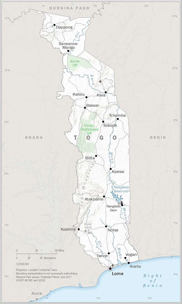 Lage: Zwischen Ghana im Westen und Benin im Osten, im Süden grenzt es an den Atlantik (Guineabucht), im Norden an Burkina Faso.